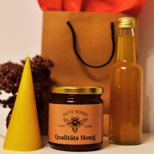 In unserer Geschenkset für Weihnachten findet sich ein Blütenhonig, ein Waldhonig ein Honiglikör und eine Bienenwachskerze.
